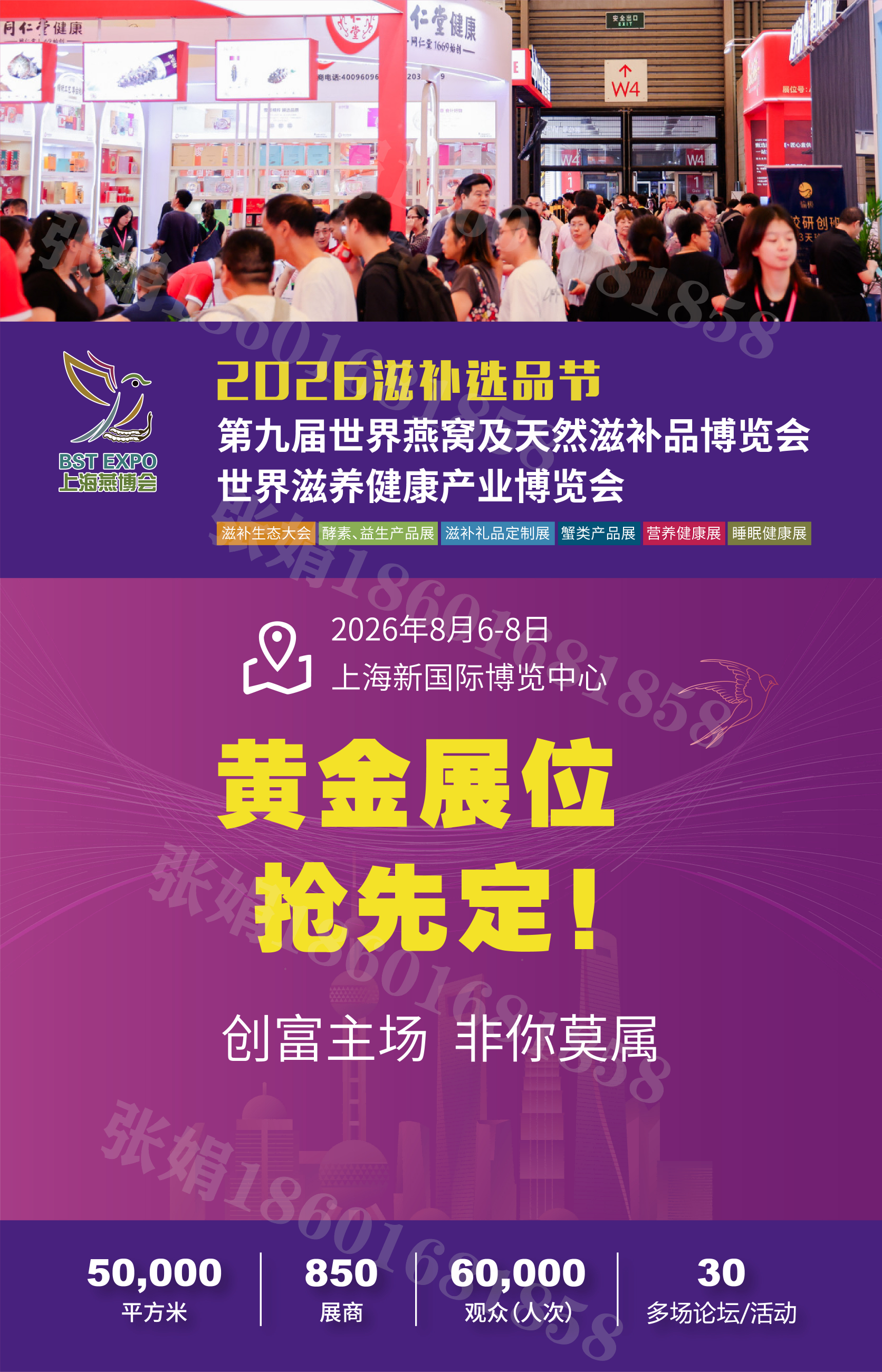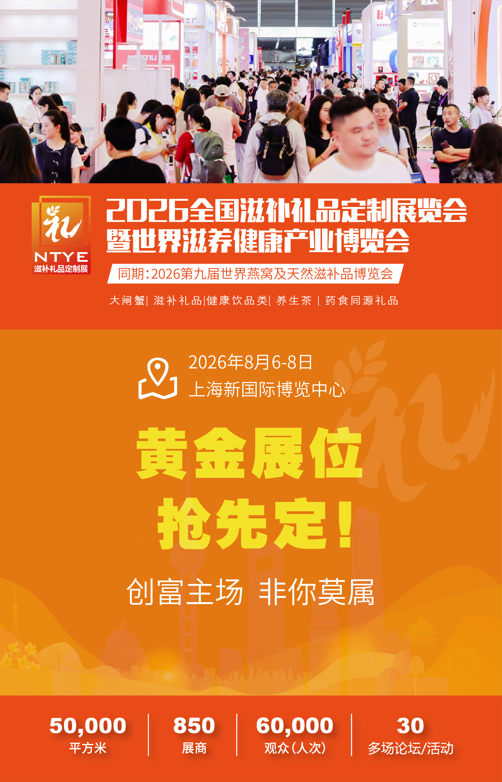 滋補選品節-上海燕博會暨世界滋養健康產業博覽會經歷了多年的發展與資源積累,已成為燕窩與滋補產業領域具有知名度和權威性的行業盛會,各地政府、行業協會、產業園區、保稅區、合作伙伴、行業精英深度探討燕窩 與滋補產業發展,并保持緊密的合作。上海燕博會作為業內頂尖行業盛會,期待各位攜手BST EXPO 2026繼續共同前行, 再創輝煌,給廣大客戶提供更優質、更專業、更全面的一站式解決方案。       同期舉辦“2026世界滋補產業生態大會、2026第十一屆酵博會、2026第八屆益生產品展、第十一屆月子健康展、滋補禮品定制展、營養健康展、世界蟹類展、全球有機食品展”等多展同期召開,預計總規模近50,000平方米展示面積,同期舉辦近30多場活動及論壇,匯集燕窩及滋補品行業上千家品牌匯聚專業買家60000多人次,圍繞“共創養生新時代,成就滋補大未來”;推動健康行業有序發展,作為行業風向標,緊隨市場發展,全面覆蓋產業鏈,為行業搭建了一個技術交流、咨詢、合作(展示、代理、招商、加盟、銷售)、擴大上下游貿易、提高品牌和企業知名度一站式服務平臺。